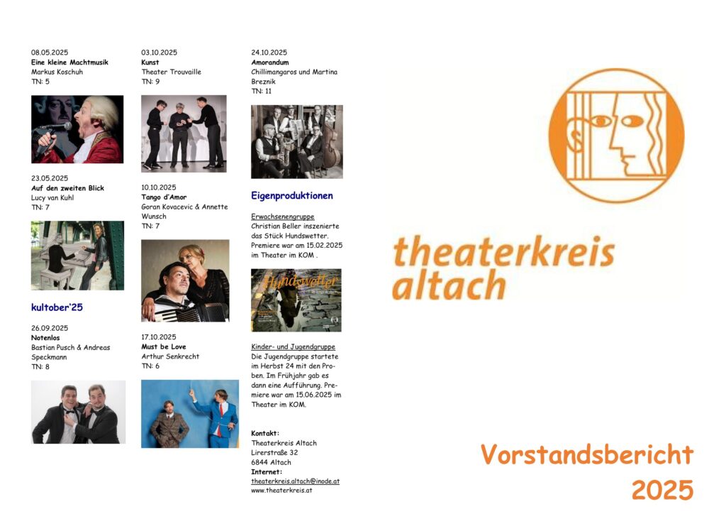Bestellung: Tickets können nur per E-Mail an theaterkreis.altach@inode.at bestellt werden. Bitte ein aktuelles Passfoto (Solo/Duo) mitschicken.